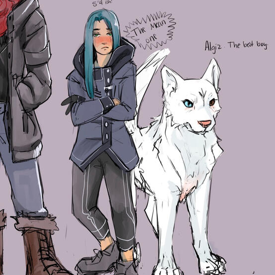 Algiz is Kacii's travel companion. He accompanies everywhere she goes, rain or shine.While having no official breed, he is very wolf-like in build with snow white fur. He has heterochromatic eyes, his right eye a striking blue and his left a deep brown. His nose and other visible skin is pink.The Algiz rune is on his forehead in black fur. Created by Kacii herself via her own magic, he has an inexplicable magical energy around him.Algiz is friendly to most everyone and everything and is highly intelligent. He is trained in non-verbal cues such as hand signals and obscure whistles.
